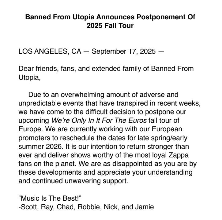 naszej nadchodzącej jesiennej trasy koncertowej We’re Only In It For The Euros po Europie. Obecnie współpracujemy z naszymi europejskimi promotorami, aby przełożyć daty na późną wiosnę/wczesne lato 2026 roku. Naszym zamiarem jest powrót silniejszymi niż kiedykolwiek i zapewnienie koncertów godnych najwierniejszych fanów Zappy na świecie. Jesteśmy równie rozczarowani tym rozwojem sytuacji, jak Wy, i doceniamy Wasze zrozumienie i nieustające, niezachwiane wsparcie.